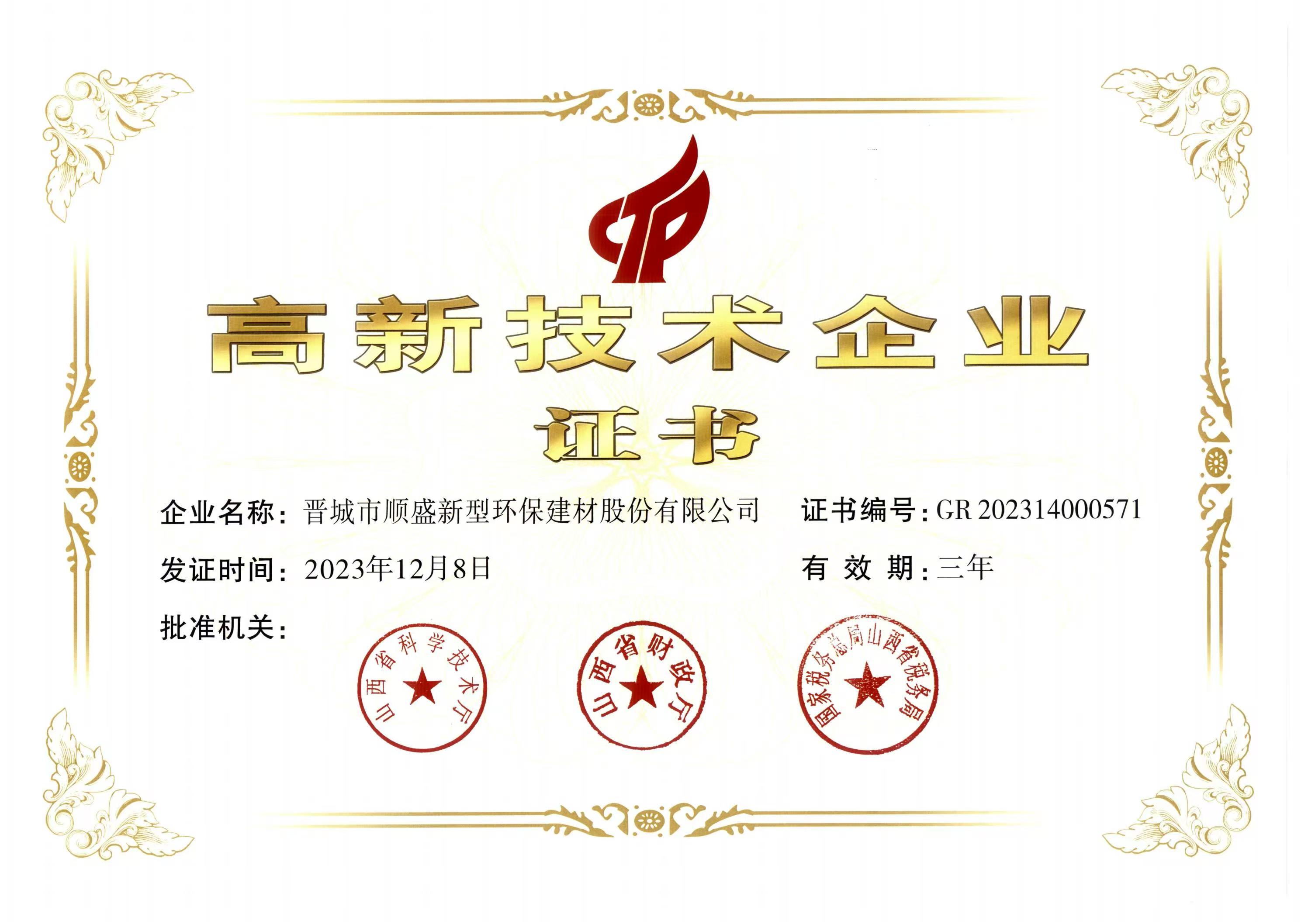 高新技術(shù)企業(yè)證書(晉城市順盛新型環(huán)保建材股份有限公司)