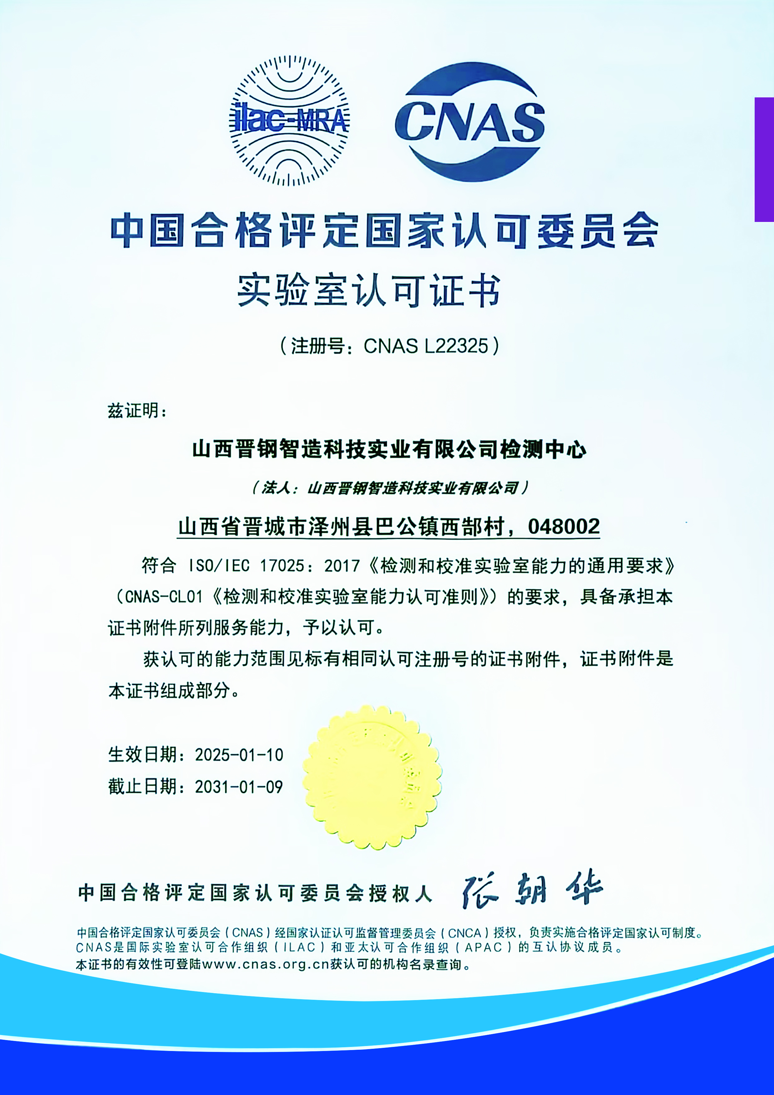 晉鋼智造科技實(shí)業(yè)有限公司檢測(cè)中心CNAS認(rèn)可證書