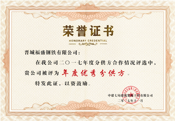 中建七局建裝工程有限公司“年度優(yōu)秀分供方”